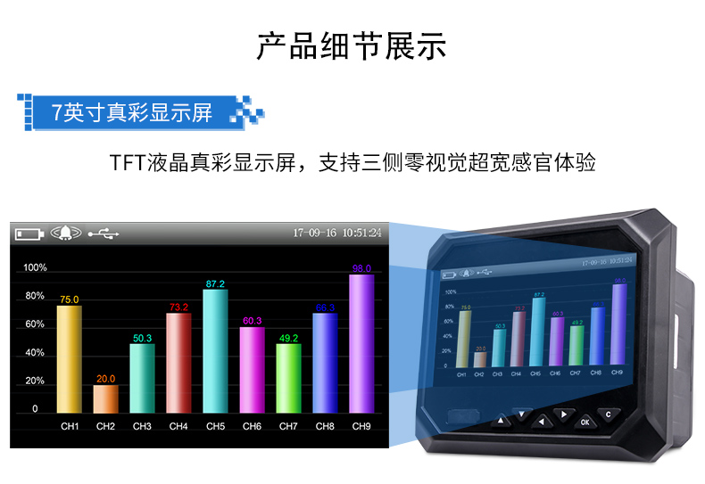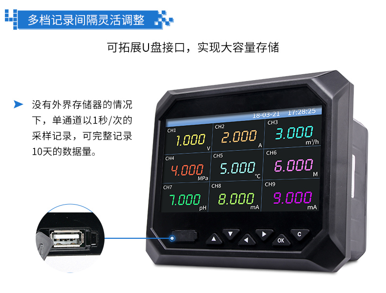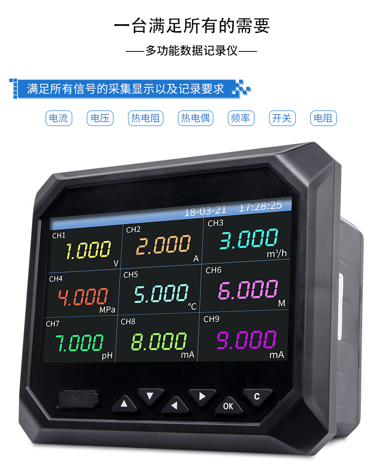 無紙記錄儀是將工業(yè)現(xiàn)場的各種需要監(jiān)視記錄的輸入信號,比如熱電阻和熱電偶的溫度信號、流量計的流量信號、 壓力變送器的壓力信號等。通過高性能微處理器進行數(shù)據(jù)處理,一方面在高分辨液晶顯示屏幕上以多種形式的畫面顯 示出來,另一方面把這些監(jiān)察信號的數(shù)據(jù)存放在儀表內(nèi)部的大容量存儲芯片內(nèi),以便在儀表上直接進行數(shù)據(jù)和圖形查 詢、翻閱和打印。