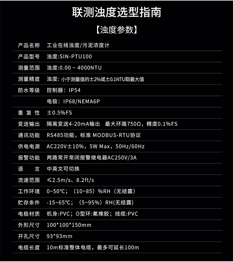 聯測SIN-PTU100在線濁度分析儀內置微處理器,適用于于污水廠、自來水廠、水站、地表水、工業等領域濁度監測,例如:污水廠沉淀池、造紙漿液池、提升泵站、氧化溝濁度測量等。